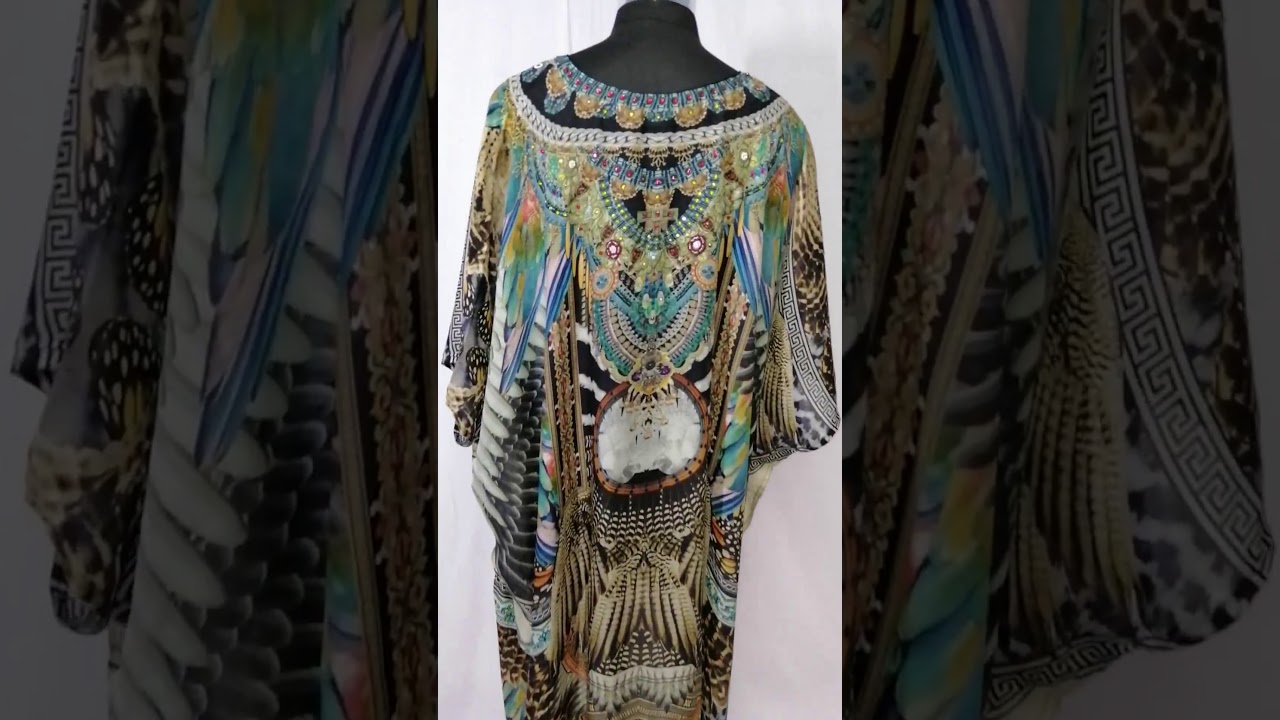 This exotic tribal printed silk kaftan with bottom cuts revamps your form. You can wear it on beaches or even parties extravagant and lavish adherence to justify your splendor. The print over its neck print is hand placed with small colorful beads with refinement. Your caliber intensifies in front of your people as it adds on confidence in bodyline and looks effective. #ExoticSilkKaftan #EthnicWear #MaxiLongSilkKaftan #BohoStyleKaftans #NeckPrint #EmbellishedKaftans #EmbeddedNeckKaftans #Extravagant #Stylish #Women’sFashion #Traditionaltribal #BeachKaftans #KaftanTops #MaxiDress