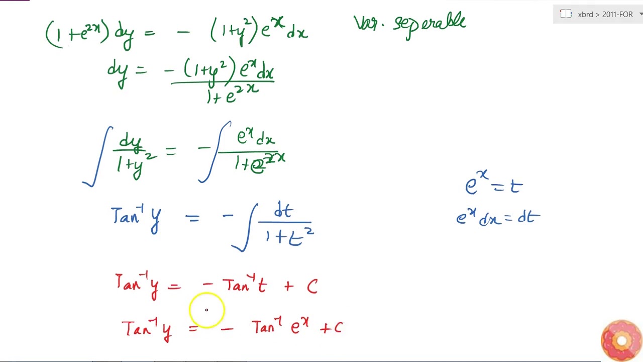 "Find the particular solution of the differential equation: `(1+e^(2x))dy+(1+y^2)e^x dx=0,`